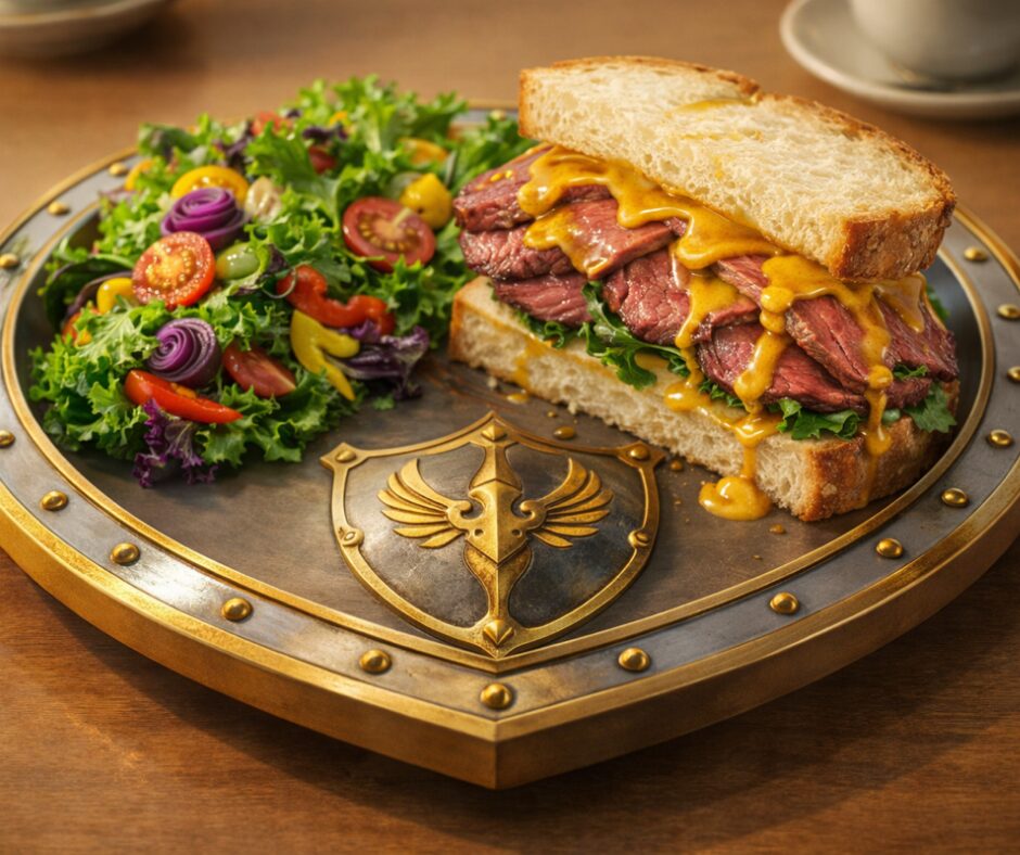 厚切りローストビーフと特製ゴールドソースを重ねた贅沢サンド。 仲間を守る一口ごとに感じる、力強い味わい!