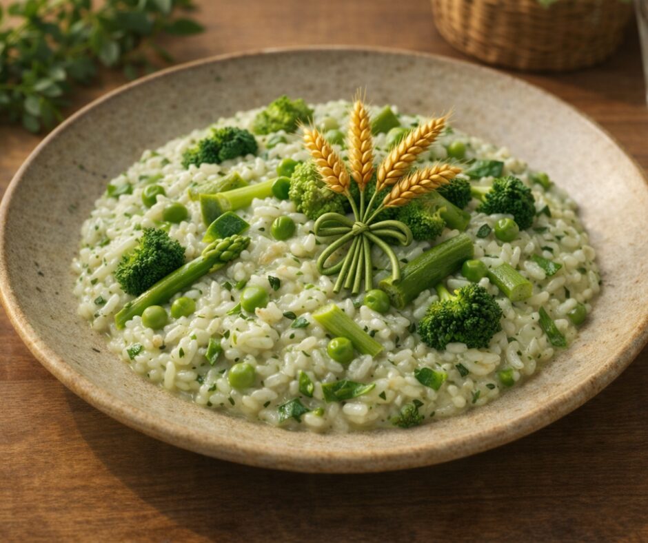 ハーブ香るクリーミーリゾットに緑野菜を彩りよく添えて。 静かな森で紡がれる魔法のように、優しく広がる一口。