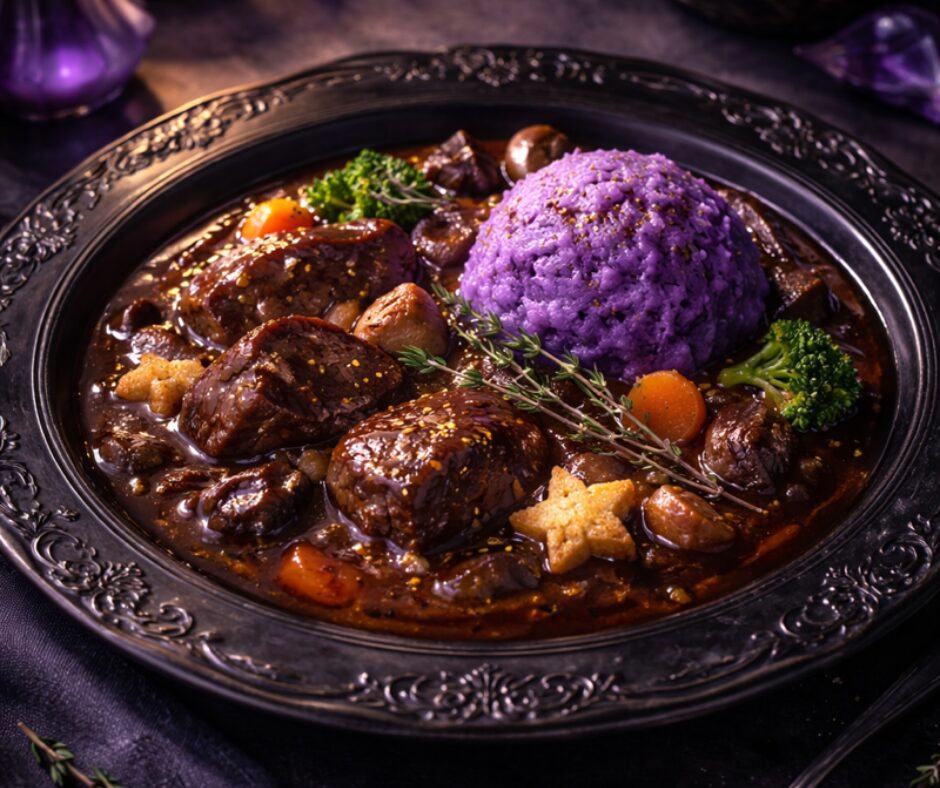 深いコクのビーフシチューに紫のマッシュポテトを添えて。夜空に浮かぶ紫の月と星をひと皿に閉じ込めた、幻想的な甘美と闇が溶け合う妖しく濃厚な味。