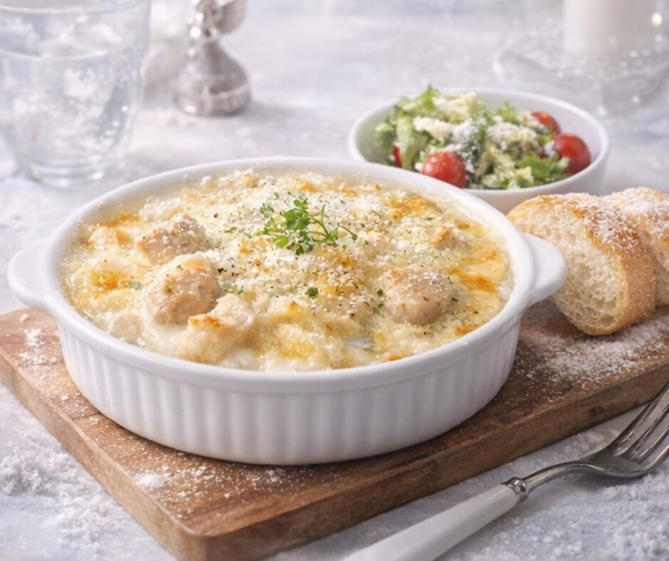 ホワイトソースと柔らかチキンに、表面にかかった粉雪チーズ。 一見優しい、だが奥に静かな塩味。