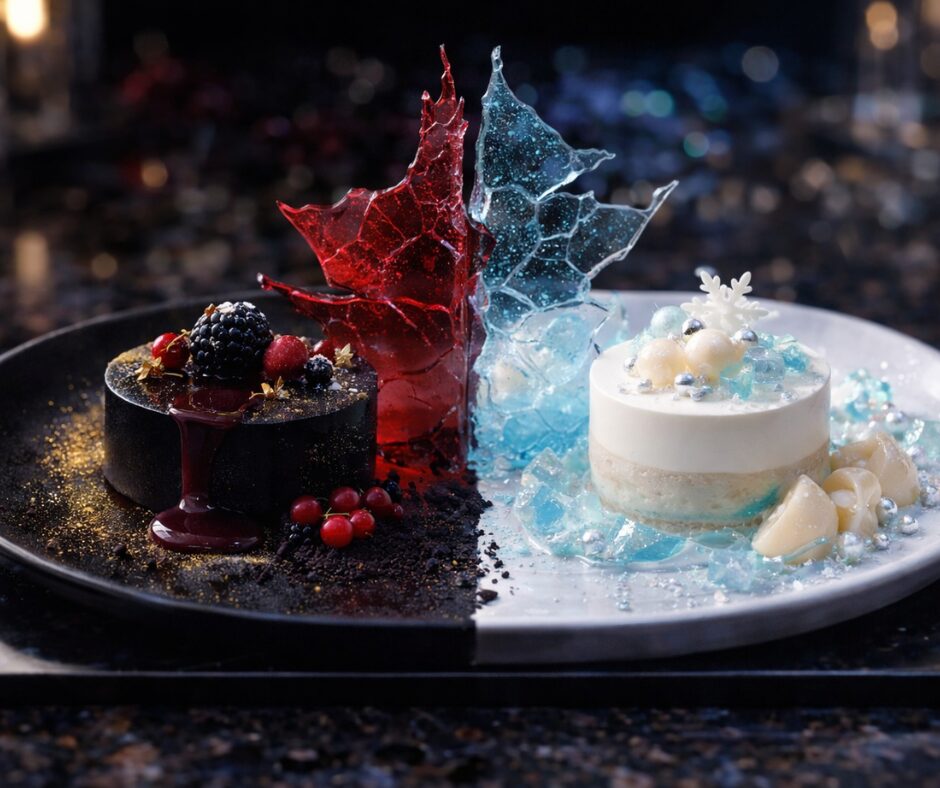 白と黒のハーフ&ハーフデザート。光と闇、静寂と情熱。相反する二つの力が激しくぶつかり合い、一つの皿の上で共鳴するデザートプレートです。